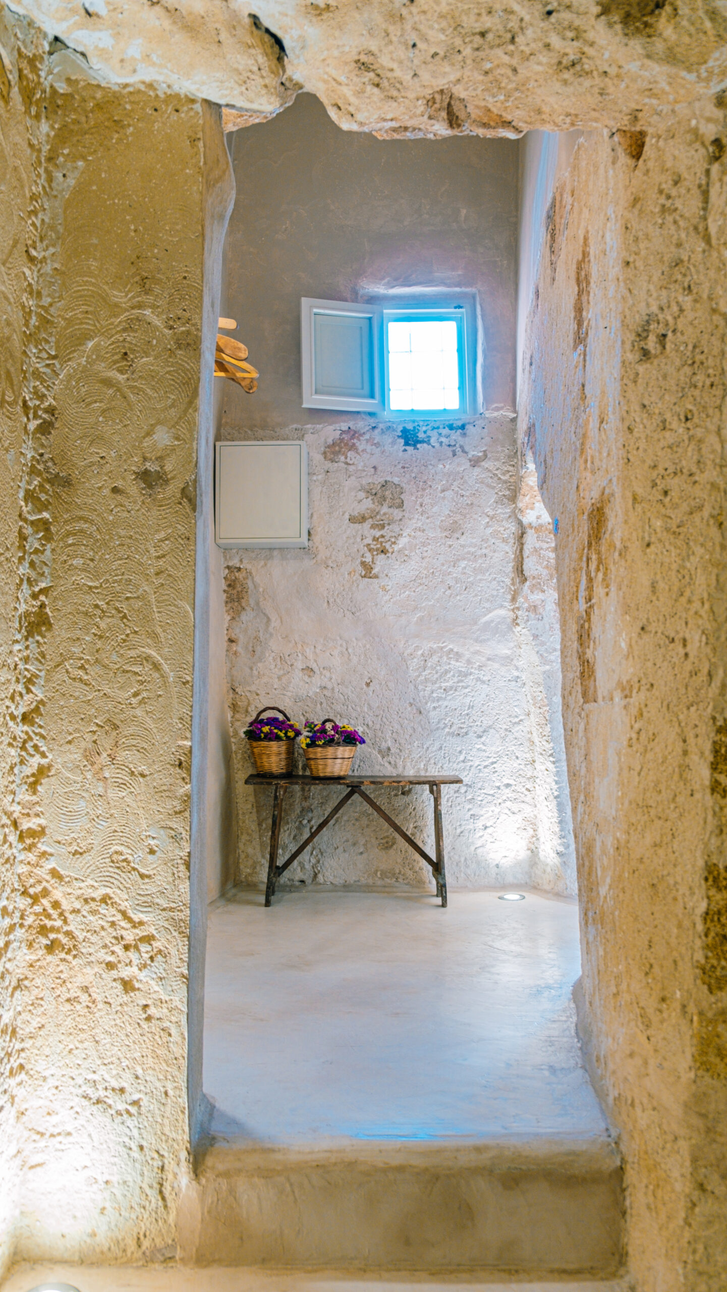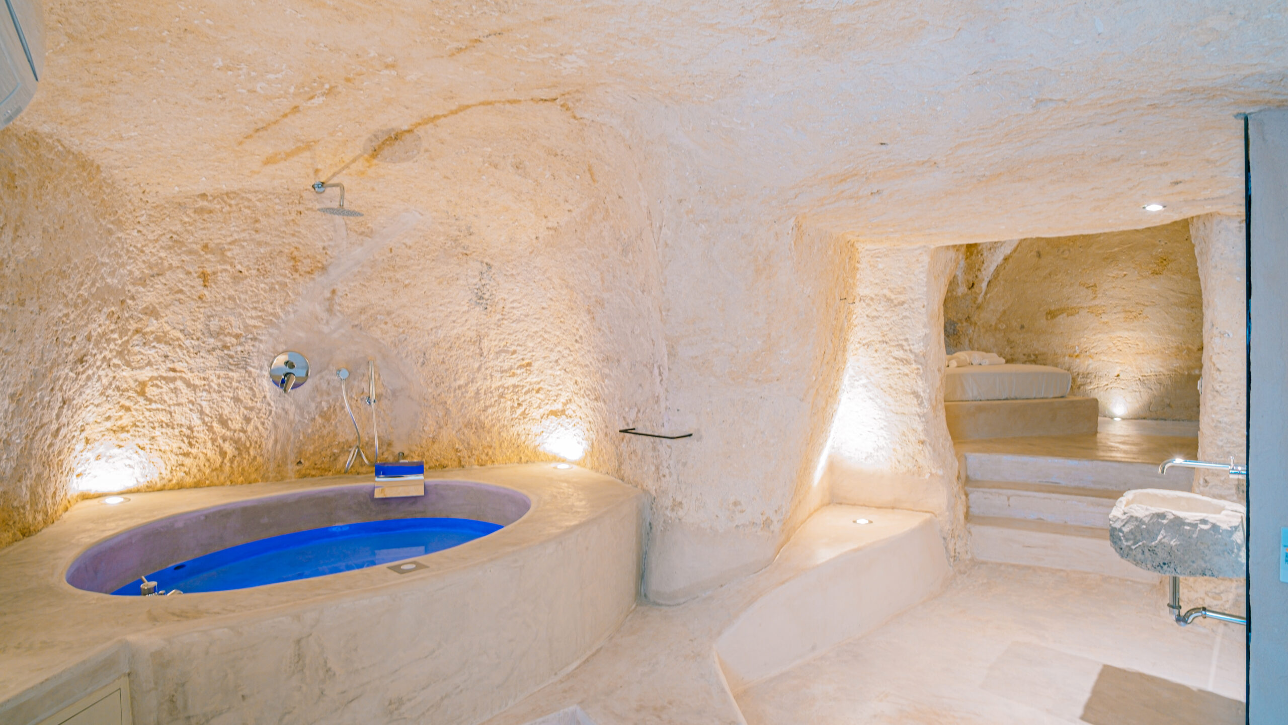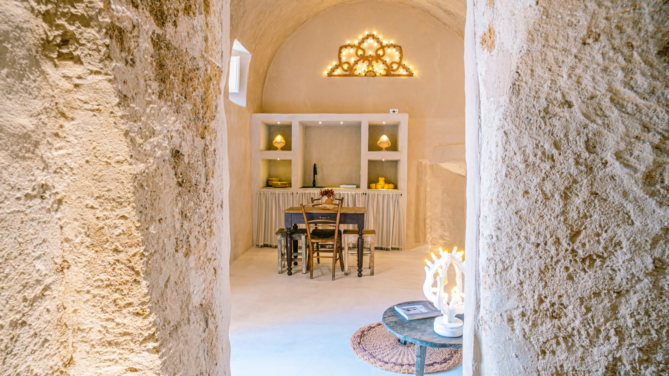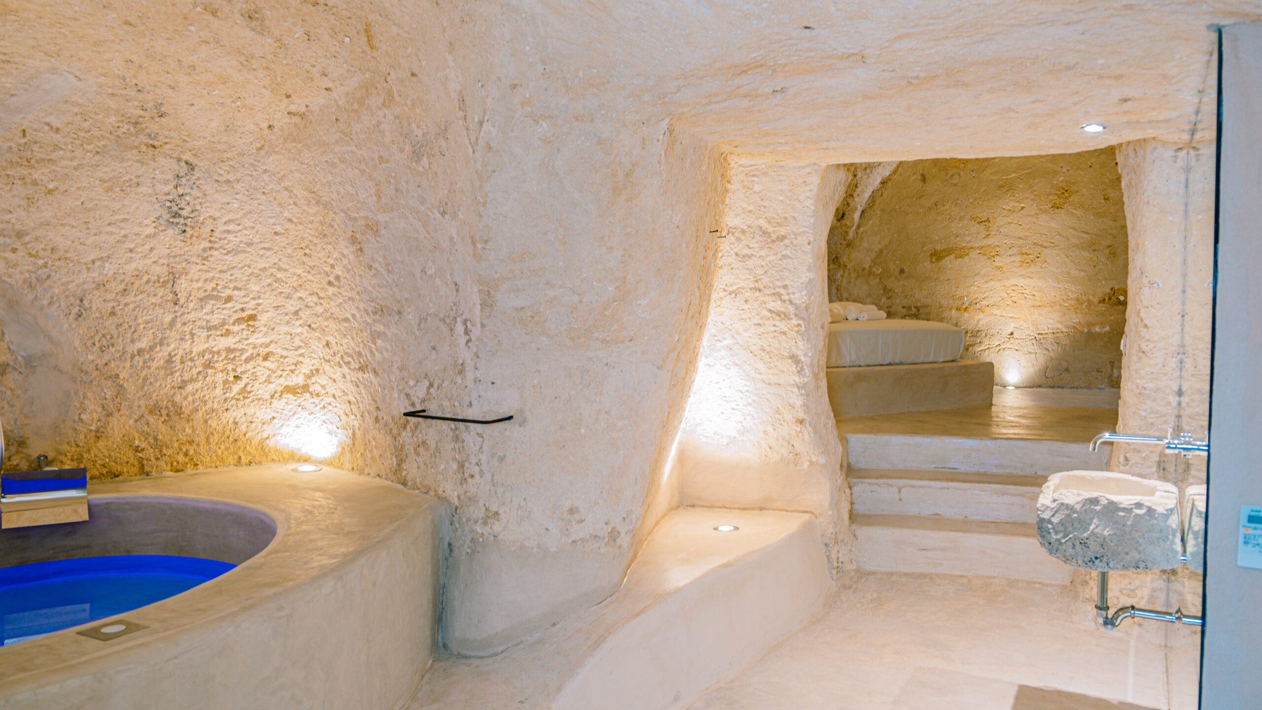 Una location unica, ad alto tasso di emozione: Grotta del Tufo – Salento Experience, vi accoglierà nel suo confortevole abbraccio. Un luogo che profuma d’antico e che offre tutti i comfort più moderni, in un affascinante mix di storia e design. Un accorto intervento di restauro conservativo ha valorizzato un’antica abitazione situata nel centro storico di Matino, Salento puro, realizzando un nido dall’atmosfera romantica. Gli spazi dedicati alla zona giorno, ricchi di nicchie e dettagli originali, sono in pietra tipica leccese, e la sorpresa è una suggestiva alcova ricavata all’interno di una grotta calcarea, cuore della suite. La grotta era con ogni probabilità una delle prime ingegnose soluzioni abitative adottate dagli abitanti del posto, e la suggestione di un soggiorno in un luogo così esclusivo rende l’esperienza straordinaria. Anche la zona dedicata alla vasca da bagno è ricavata nella roccia, mentre il lavabo è realizzato con un unico blocco di elegante pietra grezza. Il bianco e il tipico giallo crema dei materiali da costruzione tipici del Salento creano una calda armonia cromatica, enfatizzata da una sapiente illuminazione. La possibilità di vivere all’interno di un ambiente naturale avvicina l’uomo alla natura più autentica del luogo, restituendo forza e spiritualità. Il progetto di riqualificazione partecipa ad un modello di turismo sostenibile di alto livello, che porta alla perfezione e alla bellezza di una terra, il Salento, le cui preziose perle – ancora nascoste – riservano momenti di grande emozione. Alloggiare nella storia non è mai stato così entusiasmante.